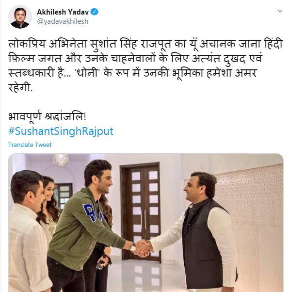 उत्तर प्रदेश के पूर्व मुख्यमंत्री अखिलेश यादव ने भी सुशांत सिंह के निधन पर उन्हें याद किया है। अखिलेश यादव ने ट्विटर पर भावपूर्ण श्रद्धांजलि! के साथ लिखा कि लोकप्रिय अभिनेता सुशांत सिंह राजपूत का यूँ अचानक जाना हिंदी फिल्म जगत और उनके चाहनेवालों के लिए अत्यंत दुखद एवं स्तब्धकारी है... ‘धोनी’ के रूप में उनकी भूमिका हमेशा अमर रहेगी।