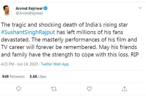फिल्म अभिनेता सुशांत सिंह के निधन पर दिल्ली के मुख्यमंत्री अरविंद केजरीवाल ने ट्विटर पर लिखा कि भारत के उभरते सितारे सुशांत सिंह राजपूत की दुखद और चौंकाने वाली मौत ने उनके लाखों प्रशंसकों को गहरा दुख पहुंचाया है। सुशांत के फिल्म और टीवी के शानदार करियर को हमेशा याद किया जाएगा। इसके साथ ही केजरीवाल ने सुशांत सिंह राजपूत को श्रद्धांजलि देते हुए लिखा कि इस गहरे दुख में उनके दोस्तों और परिवार को ताकत मिले।