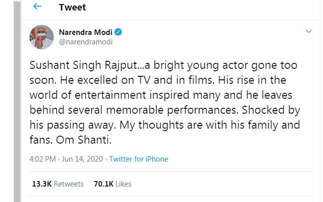 युवा फिल्म अभिनेता के निधन पर प्रधानमंत्री नरेंद्र मोदी ने गहरा दुख व्यक्त करते हुए ट्विटर पर लिखा कि सुशांत सिंह राजपूत... एक उज्जवल युवा अभिनेता बहुद जल्दी ही चला गया। उन्होंने टीवी और फिल्मों में बहुत अच्छा काम किया। मनोरंजन की दुनिया में उनके उदय ने कई लोगों को प्रेरित किया और वह कई यादगार एक्टिंग के जरिए हमेशा याद किए जाएंगे। उनके निधन से मैं पूरी तरह स्तब्ध हूं। इसके साथ ही पीएम मोदी ने लिखा कि मेरे विचार उनके परिवार और प्रशंसकों के साथ हैं। ओम शांति।