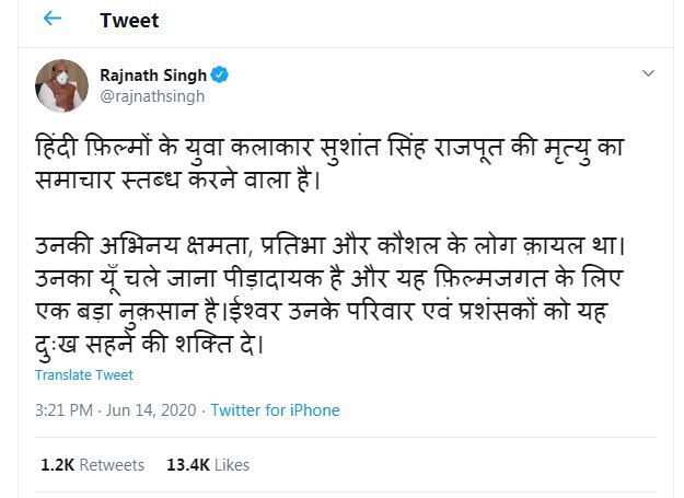 सुशांत सिंह के निधन पर रक्षा मंत्री राजनाथ सिंह ने ट्विटर पर लिखा कि हिंदी फिल्मों के युवा कलाकार सुशांत सिंह राजपूत की मृत्यु का समाचार स्तब्ध करने वाला है। उनकी अभिनय क्षमता, प्रतिभा और कौशल के लोग कायल था। उनका यूँ चले जाना पीड़ादायक है और यह फिल्मजगत के लिए एक बड़ा नुकसान है। ईश्वर उनके परिवार एवं प्रशंसकों को यह दुःख सहने की शक्ति दे।