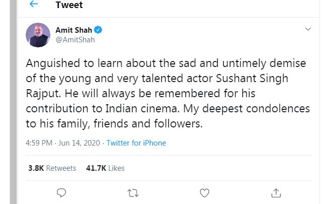 सुशांत सिंह राजपूत के निधन पर केंद्रीय गृह मंत्री अमित शाह ने भी अपना दुख प्रकट किया। उन्होंने ट्वीट कर कहा कि युवा एवं बहुत प्रतिभाशाली अभिनेता सुशांत सिंह राजपूत के निधन से बहुत दुख हुआ। भारतीय सिनेमा में उनके योगदान के लिए उन्हें हमेशा याद किया जाएगा। उनके परिवार, दोस्तों और चाहने वालों के प्रति मेरी गहरी संवेदना है।