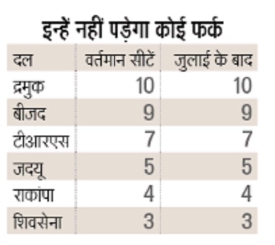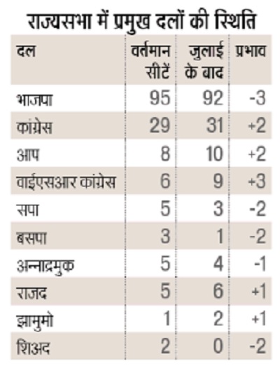 इसी साल अप्रैल में उच्च सदन में 100 के आंकड़े पर पहुंचने वाली भाजपा के सदस्यों की संख्या राज्यसभा की 57 सीटों के लिए हाल में हुए द्विवार्षिक चुनावों के बाद 95 से घटकर 91 पर आ गई। 57 सदस्यों को मिलाकर वर्तमान में उच्च सदन के कुल 232 सदस्यों में भाजपा के 95 सदस्य हैं। सेवानिवृत्त हो रहे सदस्यों में भाजपा के 26 सदस्य शामिल हैं जबकि इस द्विवार्षिक चुनाव में उसके 22 सदस्यों ने जीत दर्ज की। इस प्रकार उसे चार सीटों का नुकसान हुआ है। निर्वाचित सदस्यों के शपथ लेने के बाद भाजपा के सदस्यों की संख्या 95 से घटकर 91 रह जाएगी। यानी फिर से 100 के आंकड़े तक पहुंचने के लिए भाजपा को अभी और इंतजार करना पड़ेगा।