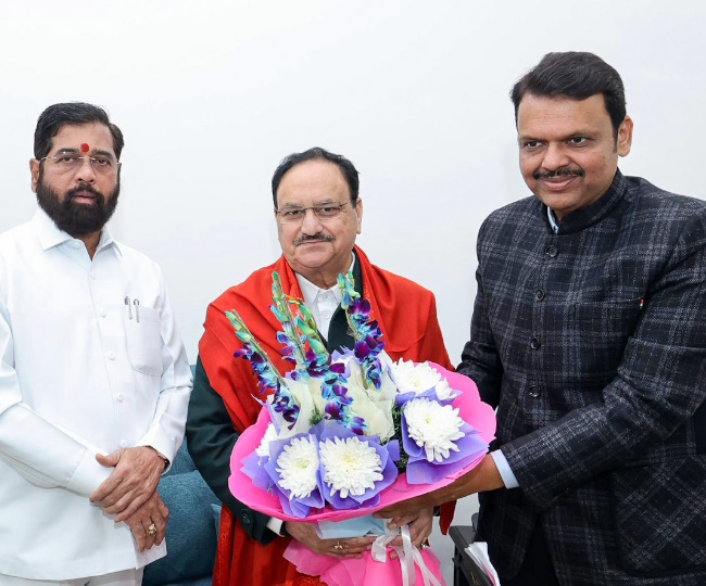 ( भाजपा अध्यक्ष जेपी नड्डा, महाराष्ट्र के कार्यवाहक सीएम एकनाथ शिंदे और भाजपा नेता देवेंद्र फडणवीस। फोटो- एएनआई)