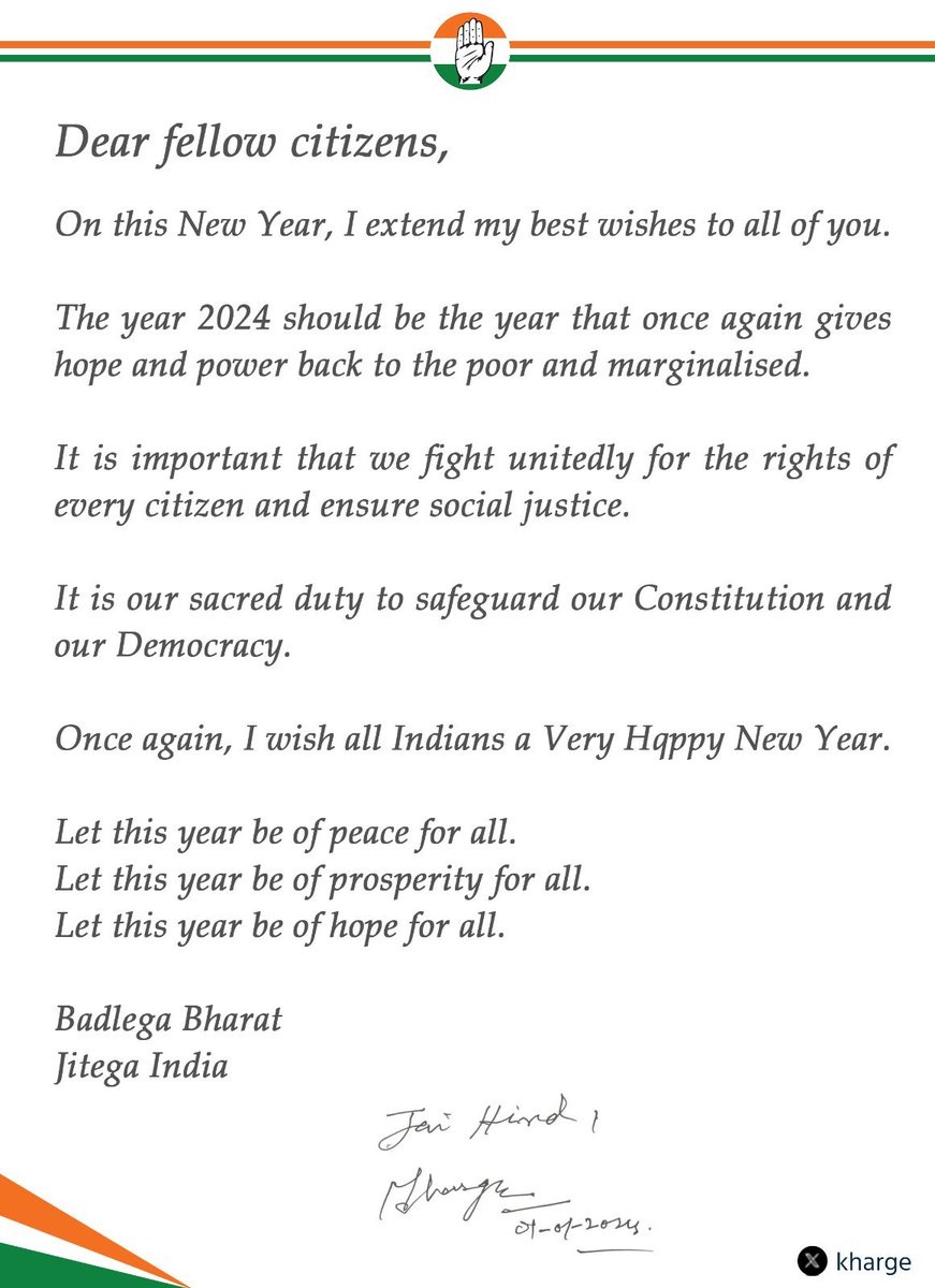 नए साल के मौके पर कांग्रेस के राष्ट्रीय अध्यक्ष मल्लिकार्जुन खरगे ने लोगों को बधाई देते हुए एक खास संदेश लिखा,"इस नव वर्ष पर मैं आप सभी को हार्दिक शुभकामनाएं देता हूं। वर्ष 2024 वह वर्ष होना चाहिए, जो एक बार फिर गरीबों और हाशिये पर पड़े लोगों को आशा और शक्ति वापस दे।"