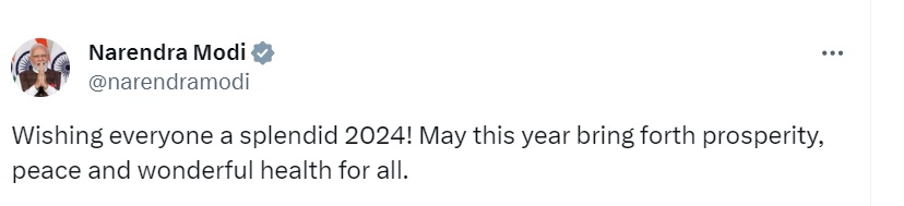 प्रधानमंत्री नरेंद्र मोदी ने न्यू ईयर 2024 की बधाई दी है। उन्होंने सोशल मीडिया हैंडल एक्स पर नए साल पर सभी लोगों को बधाई देते हुए लिखा,"सभी को शानदार 2024 की शुभकामनाएं! यह वर्ष सभी के लिए समृद्धि, शांति और अद्भुत स्वास्थ्य लेकर आए।"