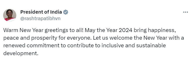 डिजिटल डेस्क, नई दिल्ली। New Year Greetings 2024। साल 2024 का आगमन हो चुका है। नए साल के मौके पर देश की राष्ट्रपति द्रौपदी मुर्मू ने सभी लोगों नए साल की शुभकामनाएं दी। उन्होंने सोशल मीडिया हैंडल एक्स पर लिखा,"सभी को नव वर्ष की हार्दिक शुभकामनाएँ! वर्ष 2024 सभी के लिए सुख, शांति और समृद्धि लाए। आइए हम समावेशी और सतत विकास में योगदान देने की नई प्रतिबद्धता के साथ नए साल का स्वागत करें।"