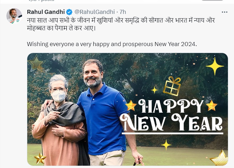 वहीं, कांग्रेस नेता राहुल गांधी ने कांग्रेस की पूर्व राष्ट्रीय अध्यक्ष और अपनी मां सोनिया गांधी के साथ अपनी एक फोटो सोशल मीडिया पर शेयर की। वहीं, उन्होंने नए साल की बधाई देते हुए लिखा,"नया साल आप सभी के जीवन में खुशियां और समृद्धि की सौगात और भारत में न्याय और मोहब्बत का पैगाम लेकर आए।"