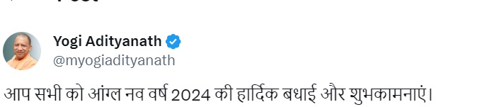 उत्तर प्रदेश के मुख्यमंत्री योगी आदित्यनाथ ने नए साल पर लोगों को बधाई देते हुए एक्स पर लिखा,"आप सभी को आंग्ल नव वर्ष 2024 की हार्दिक बधाई और शुभकामनाएं।"