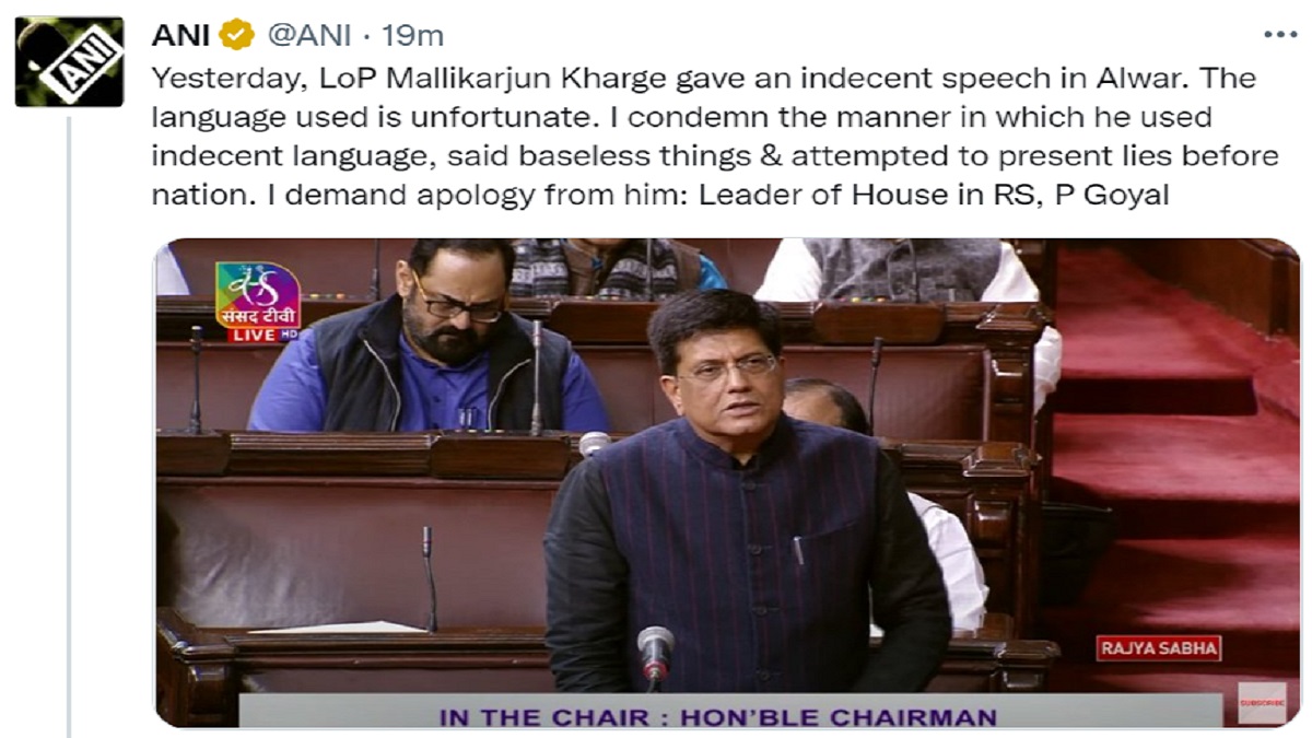 पीयूष गोयल ने आगे कहा कि खरगे को भाजपा, संसद और इस देश की जनता से माफी मांगनी चाहिए जिन्होंने पूर्ण बहुमत से भाजपा की सरकार बनाई। खरगे ने अपनी मानसिकता और ईर्ष्या की एक झलक दिखाई है।