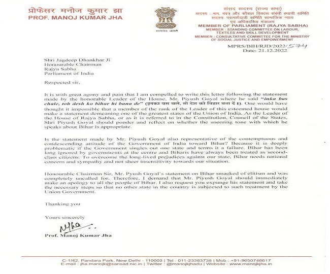 राजद सांसद मनोज झा ने राज्यसभा के सभापति जगदीप धनखड़ को पत्र लिखकर सदन के नेता और केंद्रीय मंत्री पीयूष गोयल से सभी लोगों से माफी मांगने की मांग की है। उन्होंने कहा है कि अगर इनका बस चले तो देश को बिहार ही बना दें।