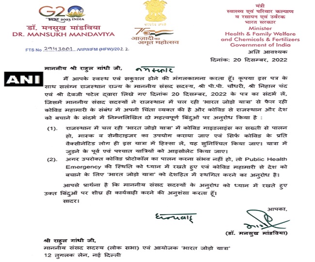 केंद्रीय स्वास्थ्य मंत्री मनसुख मंडाविया ने कांग्रेस सांसद राहुल गांधी और राजस्थान के मुख्यमंत्री अशोक गहलोत को पत्र लिखा है। पत्र में कहा गया है कि भारत जोड़ो यात्रा के दौरान कोविड दिशा-निर्देशों का सख्ती से पालन किया जाए और मास्क-सैनिटाइजर का उपयोग लागू किया जाए।