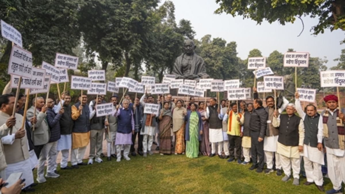 Parliament winter session Live शीतकालीन सत्र आज समाप्त होने जा रहा है। आज संसद की कार्यवाही शुरू होते ही हंगामे के चलते लोकसभा की कार्यवाही अनिश्चितकाल तक स्थगित कर दी गई। वहीं संसद के बाहर भाजपा सांसद जहां महात्मा गांधी की प्रतिमा के पास राहुल गांधी और कांग्रेस पार्टी के खिलाफ प्रदर्शन कर रहे हैं। वहीं विपक्षी नेता चौक से संसद की ओर मार्च कर रहे हैं।