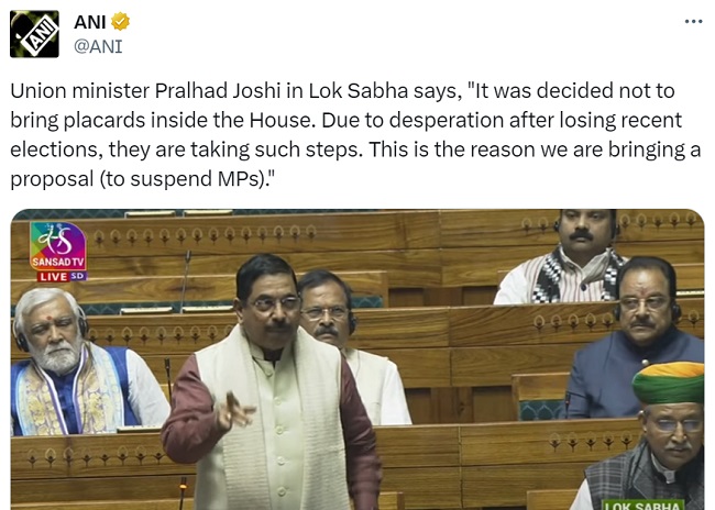 लोकसभा में केंद्रीय मंत्री प्रल्हाद जोशी ने कहा कि सदन के अंदर तख्तियां नहीं लाने का निर्णय लिया गया। हाल के चुनाव हारने के बाद हताशा के कारण वे ऐसे कदम उठा रहे हैं। यही कारण है कि हम सांसदों को निलंबित करने का एक प्रस्ताव ला रहे हैं।