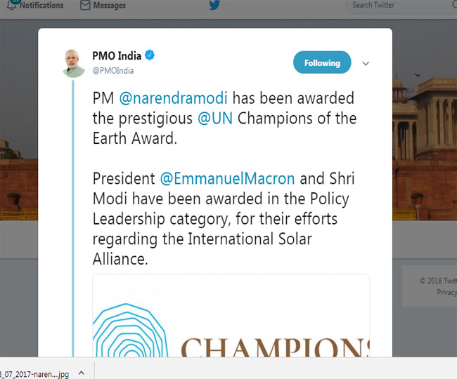 संयुक्त राष्ट्र संघ ने प्रधानमंत्री नरेंद्र मोदी को पर्यावरण के क्षेत्र में प्रतिष्ठित पुरस्कार से सम्मानित किया है। पीएम मोदी और फ्रांस के राष्ट्रपति इमैनुएल मैक्रों को 'चैंपियंस ऑफ अर्थ' के पुरस्कार के लिए चुना गया है। संयुक्त राष्ट्र के पर्यावरण विभाग ने घोषणा की है कि प्रधानमंत्री नरेन्द्र मोदी और फ्रांस के राष्ट्रपति इमैनुएल मैक्रों को नीति नेतृत्व के वर्ग में अंतरराष्ट्रीय सौर गठबंधन के क्षेत्र में उनके प्रयासों को देखते हुए दिया गया है। यह सम्मान उन्हें पॉलिसी लीडरशिप कैटेगरी में दिया गया है।