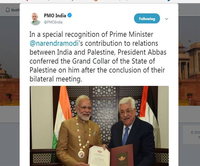 इस साल फरवरी में प्रधानमंत्री नरेंद्र मोदी फिलिस्तीन की यात्रा पर गए थे। फिलिस्तीन के यात्रा करने वाले नरेंद्र मोदी देश के पहले प्रधानमंत्री हैं। इस यात्रा के दौरान प्रधानमंत्री को फिलिस्तीन ने 'The Grand Collar of the state of Palestine' के अवार्ड से सम्मानित किया गया।