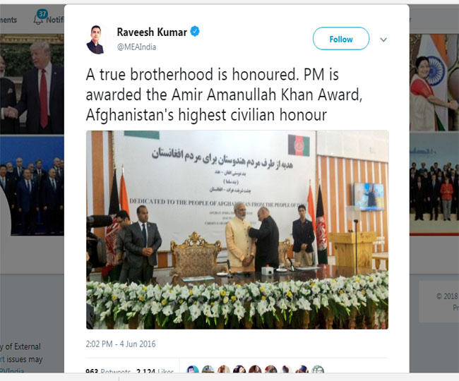 प्रधानमंत्री नरेंद्र मोदी को अफगानिस्तान के सर्वोच्च नागरिक सम्मान, आमिर अमानुल्लाह खान अवार्ड से सम्मानित किया जा चुका है। 2016 में पीएम मोदी की अफगानिस्तान की यात्रा के दौरान राष्ट्रपति अशरफ गनी ने मोदी को इस अवार्ड से नवाज़ा था।