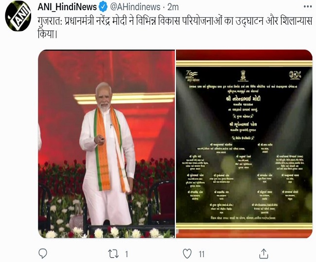 पीएम मोदी ने भरुच के आमोद में सुबह 11 बजे 8000 करोड़ रुपये लागत की विभिन्न परियोजनाओं का लोकार्पण और शिलान्यास किया। इसके बाद वे अहमदाबाद पहुंचेंगे और दोपहर तीन बजकर 15 मिनट पर मोदी शैक्षणिक संकुल का उद्घाटन करेंगे।