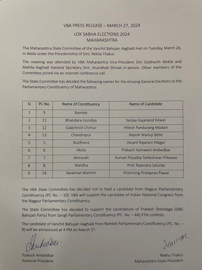 एमवीए की तरफ से चार सीटों का प्रस्ताव दिया गया था, लेकिन प्रकाश आंबेडकर सात सीटें मांग रहे थे। वंचित बहुजन अघाड़ी ने जानकारी दी कि पार्टी नागपुर लोकसभा सीट से उम्मीदवार नहीं उतारेगी। पार्टी कांग्रेस के उम्मीदवार को सपोर्ट करेगी।