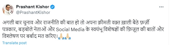 एग्जिट पोल के सामने आने के बाद चुणावी रणनीतिकार प्रशांत किशोर की प्रतिक्रिया सामने आई है। उन्होंने सोशल मीडिया हैंडल एक्स पर लिखा,"अगली बार चुनाव और राजनीति की बात हो तो अपना क़ीमती वक़्त ख़ाली बैठे फ़र्ज़ी पत्रकार, बड़बोले नेताओं और Social Media के स्वयंभू विशेषज्ञों की फ़िज़ूल की बातों और विश्लेषण पर बर्बाद मत करिए।"
