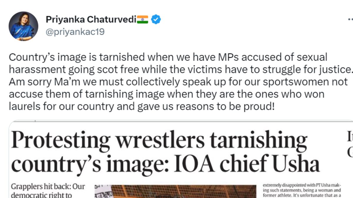 भारतीय कुश्ती महासंघ के प्रमुख बृजभूषण शरण सिंह के खिलाफ विरोध में बैठे पहलवानों की पीटी ऊषा ने गुरुवार को आलोचना की थी। इस पर आज प्रतिक्रिया देते हुए प्रियंका चतुर्वेदी ने कहा कि पीटी ऊषा को समझना होगा कि हमें सामूहिक रूप से महिला खिलाड़ियों के लिए बोलने की जरूरत है।