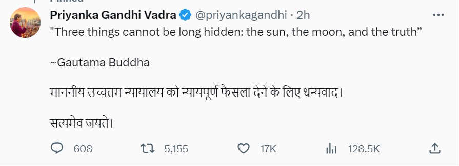 सुप्रीम कोर्ट को न्यायपूर्ण निर्णय के लिए धन्यवाद: प्रियंका गांधी