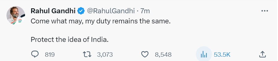 सुप्रीम कोर्ट का फैसला सामने आने के बाद राहुल गांधी ने ट्वीट किया। ट्वीट करते हुए उन्होंने लिखा,"चाहे कुछ भी हो, भारत के विचार की रक्षा करना ही मेरा कर्तव्य रहेगा।