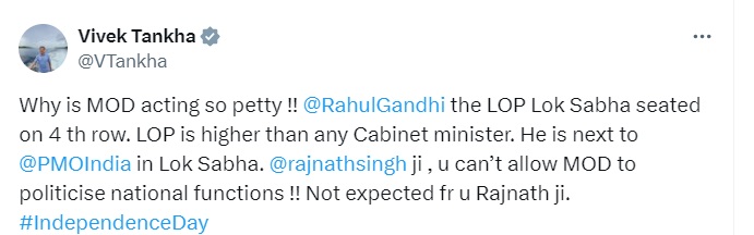 कांग्रेस के राज्यसभा सांसद विवेक तन्खा ने कहा, "रक्षा मंत्रालय इतना खराब व्यवहार क्यों कर रहा है। लोकसभा में नेता प्रतिपक्ष राहुल गांधी को चौथी कतार में बैठाया गया है। नेता प्रतिपक्ष का पद किसी भी केंद्रीय मंत्री से बड़ा होता है। लोकसभा में वह प्रधानमंत्री के बाद आते हैं। राजनाथ सिंह जी आप रक्षा मंत्रालय को राष्ट्रीय समारोह का राजनीतिकरण करने की इजाजत कैसे दे सकते हैं। आपसे इसकी उम्मीद नहीं थी।"