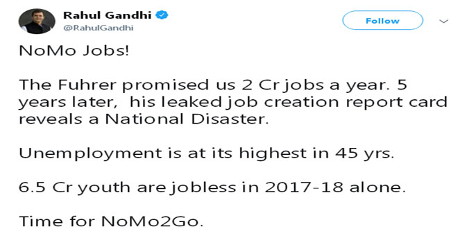 कांग्रेस अध्यक्ष ने कहा कि नौकरियों का पीएम का यह वादा राष्ट्रीय आपदा में तब्दील हो गई और अब नरेंद्र मोदी की विदाई का वक्त आ गया है। बेरोजगारी के सरकारी आंकड़ों की एनएसएसओ की मीडिया में प्रकाशित रिपोर्ट का हवाला देते हुए राहुल गांधी ने ट्वीट कर पीएम पर यह प्रहार किया। उन्होंने कहा कि अब कोई नौकरी नहीं है जबकि 5 साल पहले हर साल 2 करोड नौकरियों का हमसे वादा किया गया था। इस लीक सरकारी रिपोर्ट का हवाला देते हुए राहुल ने कहा कि बेरोजगारी 45 साल के शिखर पर है और केवल एक साल 2017-18 में ही साढ़े छह करोड़ युवा बेरोजगार रहे।