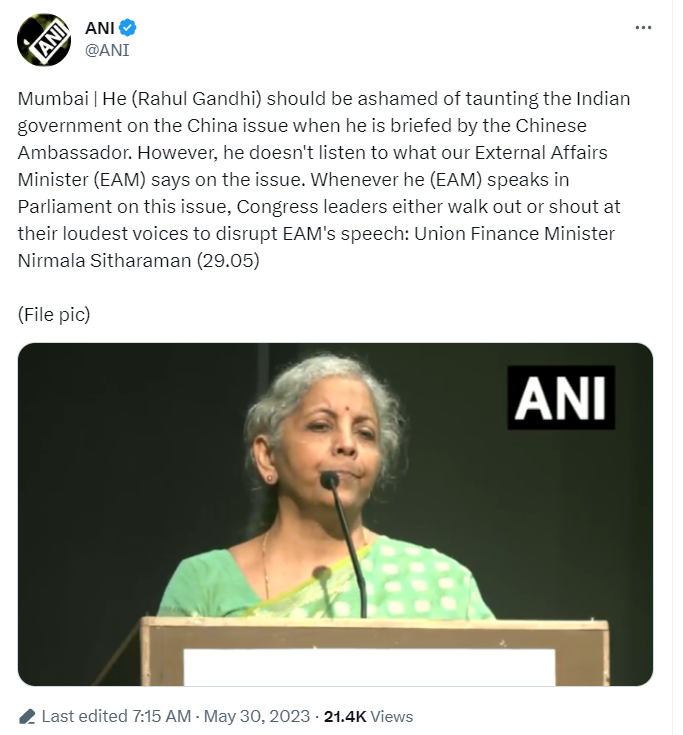 मुंबई, एजेंसी। केंद्रीय वित्त मंत्री निर्मला सीतारमण ने चीन के मुद्दे पर भारत सरकार को ताना मारने वाले कांग्रेस नेता राहुल गांधी के बयान पर निशाना साधा है। उन्होंने कहा कि राहुल गांधी को 56 इंच का ताना मारते हुए शर्म आनी चाहिए, खासकर तब जब किसी को नहीं पता कि उन्होंने चीनियों के साथ क्या समझौता किया था।