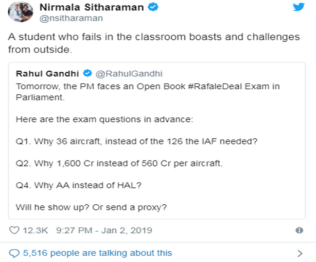 रक्षा मंत्री निर्मला सीतारमण पहले भी कई बार राफेल पर सरकार का पक्ष रख चुकी हैं। बुधवार को राहुल गांधी द्वारा राफेल मामले में किए गए ट्वीट पर भी उन्होंने तंज कसते हुए जवाब दिया। रक्षा मंत्री ने अपने ट्वीट में राहुल गांधी की तरफ इशारा करते हुए कहा, ‘एक छात्र जो कक्षा में असफल होता है और बाहर से चुनौती देता है’।