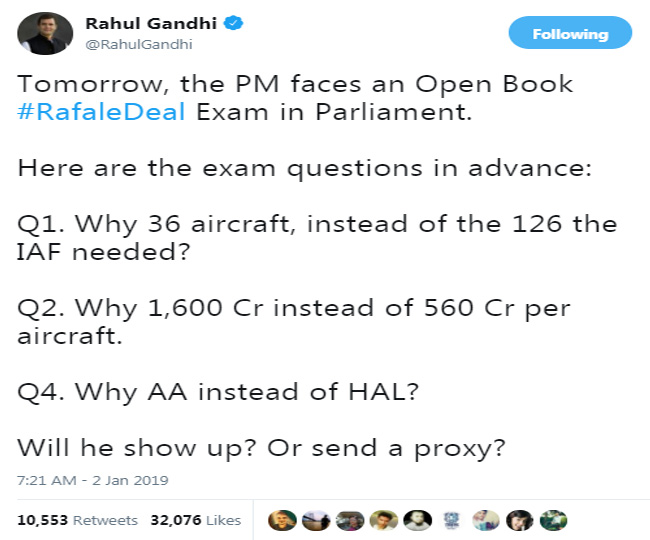 कांग्रेस अध्यक्ष राहुल गांधी ने राफेल डील मामले में प्रधानमंत्री और सरकार पर हमला करते हुए बुधवार को एक ट्वीट किया था। इस ट्वीट में राहुल गांधी ने पीएम से चार सवाल पूछे थे। हालांकि इसमें तीसरा सवाल शामिल ही नहीं था। राहुल ने सवाल नंबर एक व दो के बाद सीधे सवाल नंबर चार पूछ लिया था। इसके साथ राहुल गांधी ने कमेंट किया था कि कल (बृहस्पतिवार को) संसद में प्रधानमंत्री का राफेल डील पर ओपन बुक एग्जाम होगा। एग्जाम में आने वाले सवाल यहां एडवांस में दिए जा रहे हैं। इसके बाद राहुल गांधी ने सवाल नंबर एक, दो व चार पूछा। फिर ट्वीट के अंत में कमेंट किया कि क्या प्रधानमंत्री इन सवालों का जवाब खुद देंगे या प्रॉक्सी (छद्म व्यक्ति) को भेजेंगे?