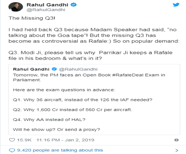सोशल मीडिया पर ट्रोल होने के कुछ घंटे बाद राहुल गांधी ने तीसरा सवाल ट्वीट किया। साथ ही उन्होंने अपने बचाव में लिखा कि उन्होंने तीसरा सवाल जानबूझकर छोड़ दिया था, क्योंकि संसद में मैडम स्पीकर ने गोवा टेप के बारे में बात करने से मना कर दिया था। लोगों की भारी मांग पर वह तीसरा सवाल पोस्ट कर रहे हैं, क्योंकि ये सवाल भी राफेल जितना ही विवादित हो गया है। चौथे सवाल में राहुल गांधी ने प्रधानमंत्री से पूछा कि मोदी जी प्लीज, हमें बताइये कि पर्रिकर जी ने राफेल डील से जुड़ी फाइल अपने बेडरूम में क्यों रखी थी और इसमें क्या है?