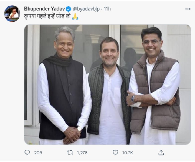 Rajasthan Politics Update News राजस्थान में जारी राजनीतिक संकट के बीच भाजपा ने कांग्रेस पर तंज कसा है। केंद्रीय मंत्री भूपेंद्र यादव ने राहुल गांधी अशोक गहलोत और सचिन पायलट की फोटो शेयर करते हुए ट्विट किया है। उन्होंने भारत जोड़ो यात्रा पर कमेंट किया है।