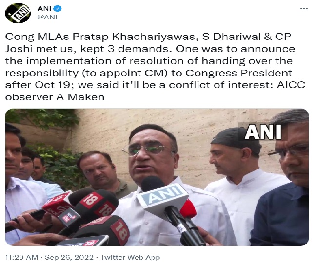 माकन ने बताया कि इनमें से एक मांग ये है कि 19 अक्टूबर के बाद कांग्रेस अध्यक्ष को जिम्मेदारी (मुख्यमंत्री नियुक्त करने की) दी जाए। हमने कहा कि इससे हितों का टकराव होगा। दूसरी शर्त है कि वे ग्रुप में साथ आना चाहते हैं जबकि हम एक-एक कर बात करेंगे। हमने साफ कर दिया कि इस तरह से काम नहीं हो सकता।