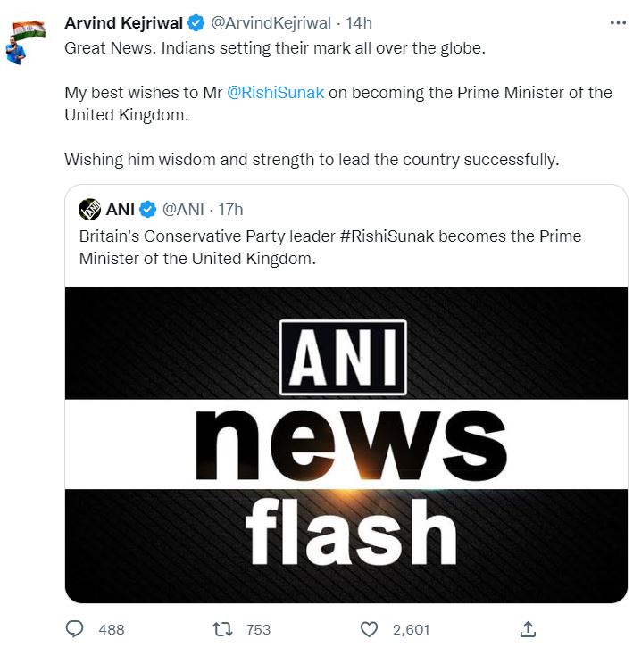 ब्रिटेन में प्रधानमंत्री का ताज हासिल करने वाले ऋषि सुनक को कई भारतीय नेताओं ने बधाई दी है। दिल्ली के मुख्यमंत्री अरविंद केजरीवाल ने ऋषि सुनक को ब्रिटेन का प्रधानमंत्री बनने पर उन्हें बधाई दी है। दिल्ली के सीएम ने सुनक को बधाई देते हुए ट्विटर पर कहा, 'जबरदस्त खबर। भारतीय पूरी दुनिया में अपनी छाप छोड़ रहे हैं। ऋषि सुनक को ब्रिटेन का प्रधानमंत्री बनने के लिए मेरी शुभकामनाएं। उन्हें देश का नेतृत्व सफलतापूर्वक करने के लिए ज्ञान और शक्ति की कामना करता हूं।'