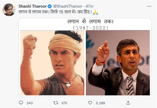 कांग्रेस के वरिष्ठ नेता शशि थरूर सोशल मीडिया पर काफी सक्रिय रहते हैं। भारतीय मूल के ऋषि सुनक ब्रिटेन के नए पीएम बनने के अवसर पर उन्होंने रोचक ट्वीट किया। उन्होंने इसे आमिर खान की फिल्म लगान से जोड़ते हुए भारत के 75 साल की उपलब्धि के रूप में इसे रखा है। उन्होंने ट्वीट किया...