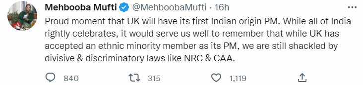 जम्मू कश्मीर की पूर्व मुख्यमंत्री और पीडीपी प्रमुख महबूबा मुफ्ती ने सुनक के ब्रिटेन के प्रधानमंत्री बनने को गौरवशाली क्षण बताते हुए कहा कि ब्रिटेन ने एक जातीय अल्पसंख्यक को अपने प्रधानमंत्री के रूप में स्वीकार किया है, लेकिन ‘हम अभी भी एनआरसी और सीएए जैसे विभाजनकारी और भेदभावपूर्ण कानूनों से बंधे हुए हैं।'