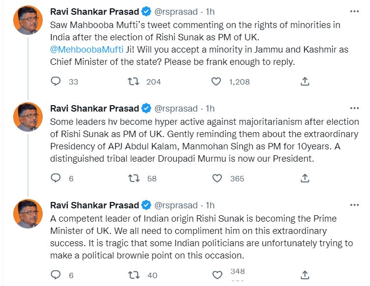 ऋषि सुनक को लेकर बीजेपी सांसद रविशंकर प्रसाद ने पीडीपी चीफ महबूबा मुफ्ती पर पलटवार किया है रविशंकर प्रसाद ने सिलसिलेवार ट्वीट में कहा, 'भारतीय मूल के एक काबिल नेता ऋषि सुनक ब्रिटेन के प्रधानमंत्री बन रहे हैं। इस असाधारण सफलता के लिए हम सभी को उनकी तारीफ करने की जरूरत है। यह दुखद है कि कुछ भारतीय राजनेता दुर्भाग्य से इस अवसर पर राजनीतिक ब्राउनी पॉइंट बनाने की कोशिश कर रहे हैं।'