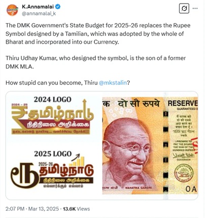 भाजपा आईटी सेल के प्रमुख अमित मालवीय ने भी रुपये के चिह्न को बदलने के लिए तमिलनाडु के मुख्यमंत्री की आलोचना की। एक्स पर एक पोस्ट में उन्होंने लिखा, "उदय कुमार धर्मलिंगम एक भारतीय शिक्षाविद और डिजाइनर हैं, जो डीएमके के एक पूर्व विधायक के बेटे हैं, जिन्होंने भारतीय रुपये का चिह्न डिजाइन किया था, जिसे भारत ने स्वीकार किया था। मुख्यमंत्री एमके स्टालिन तमिलनाडु बजट 2025-26 दस्तावेज़ से चिह्न हटाकर तमिलों का अपमान कर रहे हैं। यह कितना हास्यास्पद है?"