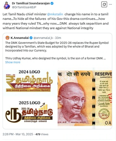 भाजपा ने तमिलिसाई सुंदरराजन ने सोशल मीडिया प्लेटफॉर्म एक्स पर लिखा,"तमिलनाडु के मुख्यमंत्री को अपना नाम बदलकर तमिल नाम रखना चाहिए। अपनी सरकार की सभी विफलताओं को छिपाने के लिए यह नाटक जारी है।"