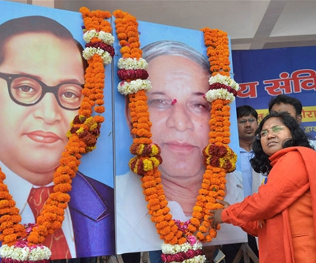 लखनऊ, [आनन्द राय]। कांशीराम स्मृति उपवन के मैदान में रविवार को आयी भीड़ की निगाहों में गेरुआ वस्त्र पहनीं भाजपा सांसद साध्वी सावित्री बाई फुले थीं, लेकिन पूरा पंडाल नीले झंडे-बैनर और जय भीम के नारों से गूंज रहा था। आंबेडकर और कांशीराम के कटआउट भी जगह-जगह लगे थे।