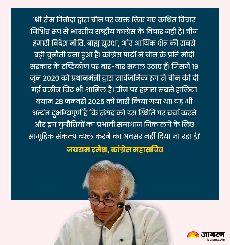 कांग्रेस के महासचिव जयराम रमेश ने सोशल मीडिया प्लेटफॉर्म एक्स पर एक पोस्ट किया। उन्होंने सोशल मीडिया प्लेटफॉर्म एक्स पर लिखा, "सैम पित्रोदा द्वारा चीन पर व्यक्त किए गए कथित विचार निश्चित रूप से भारतीय राष्ट्रीय कांग्रेस के विचार नहीं हैं।"