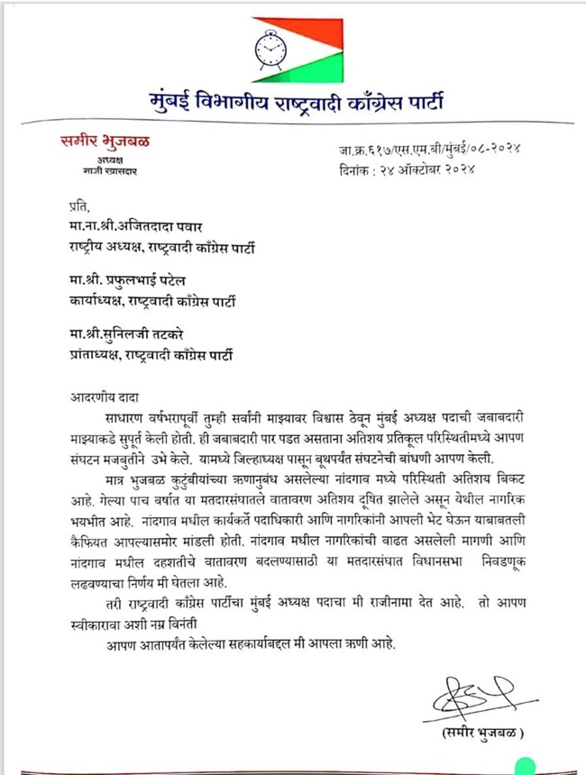 राज्य सरकार में मंत्री और वरिष्ठ नेता छगन भुजबल के भतीजे समीर भुजबल एनसीपी के मुंबई इकाई के अध्यक्ष थे। उन्होंने नांदगांव विधानसभा सीट से निर्दलीय प्रत्याशी के तौर पर चुनाव लड़ने का एलान भी कर दिया है।