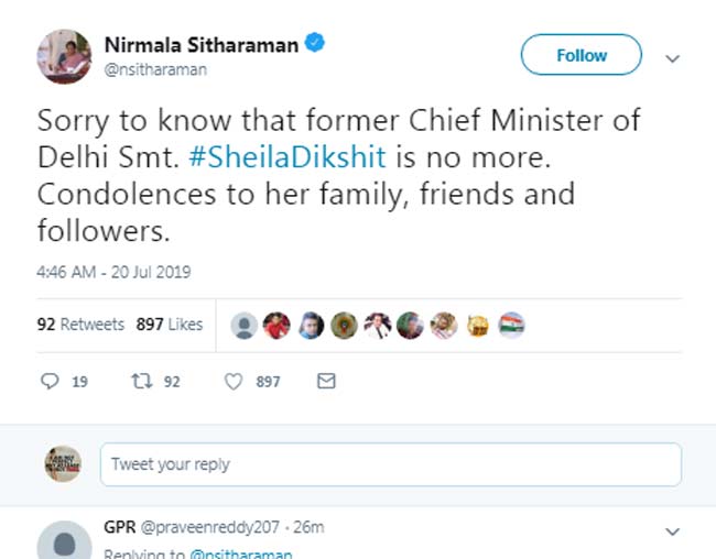 Deeply saddened by the demise of Sheila Dikshit Ji. Blessed with a warm and affable personality, she made a noteworthy contribution to Delhi’s development. Condolences to her family and supporters. Om Shanti. pic.twitter.com/jERrvJlQ4X