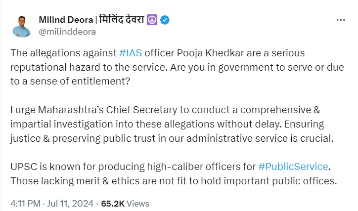 ट्रेनी आईएएस अधिकारी पूजा खेडकर की काफी चर्चा हो रही है। फर्जी प्रमाण पत्र जमा कर आईएएस बनने के आरोपों की जांच के लिए केंद्र सरकार ने समिति का गठन कर दिया है। इस मामले पर राज्यसभा सांसद मिलिंद देवड़ा ने प्रतिक्रिया दी। उन्होंने कहा कि नौकरशाहों की प्रणाली में जवाबदेही होनी चाहिए। उन्होंने आगे कहा कि सार्वजनिक सेवा में कार्यरत व्यक्तियों को अपने कार्यों के लिए जवाबदेह होना चाहिए।