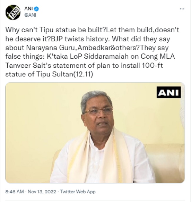 कांग्रेस नेता ने भाजपा पर इतिहास को तोड़-मरोड़ कर पेश करने का आरोप लगाया। सिद्धारमैया ने कहा कि भाजपा ने नारायण गुरु, आंबेडकर और अन्य के बारे में क्या कहा? वे झूठी बातें कहते हैं। मालूम हो कि कांग्रेस की ओर से टीपू सुल्तान की प्रतिमा स्थापित करने की योजना को लेकर उस समय बयान दिया, जब बीते शुक्रवार को पीएम मोदी ने राजधानी बेंगलुरु में नादप्रभु केंपेगौड़ा की 108 फीट की प्रतिमा का अनावरण किया था।
