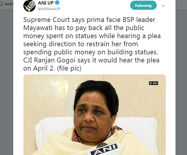 बता दें कि सुप्रीम कोर्ट में साल 2009 में रविकांत समेत कुछ लोगों ने याचिका दायर की थी। जिसपर सुनवाई चल रही थी। इस दौरान सुप्रीम कोर्ट ने कहा कि मायावती को मूर्तियों पर खर्च सभी पैसे को सरकारी खजाने में वापस करने होंगे। सुनवाई के दौरान चीफ जस्टिस रंजन गोगोई ने मायावती के वकील से कहा कि अपने मुवक्किल से कह दीजिए कि वह मूर्तियों पर खर्च हुए पैसों को सरकारी खजाने में जमा करवा दें।
