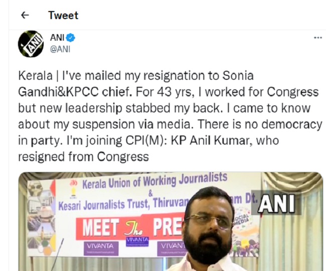 कांग्रेस को केरल से मिला झटका, निलंबित नेता केपी अनिल कुमार ने तोड़ा 43 साल का नाता; सोनिया गांधी को भेजा इस्तीफा