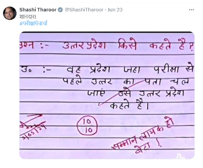 शशि थरूर ने 23 जून को एक कॉपी की फोटो अपने आधिकारिक एक्स अकाउंट पर साझा की। कॉपी में एक सवाल लिखा है, "उत्तर प्रदेश किसे कहते हैं?" इसके नीच जवाब लिखा कि वह प्रदेश जहां परीक्षा से पहले उत्तर का पता चल जाए, उसे उत्तर प्रदेश कहते हैं।" शशि थरूर ने पोस्ट में हैशटैग "परीक्षा पे चर्चा" लिखा है।