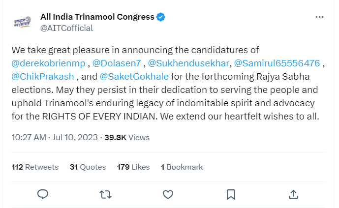 राज्य के छह सांसदों डेरेक ओ'ब्रायन, सुष्मिता देव, डोला सेन, सुखेंदुशेखर रॉय, शांता छेत्री का कार्यकाल 18 अगस्त को समाप्त हो रहा है। इनमें शांता और सुष्मिता को इस लिस्ट से बाहर कर दिया गया है। टीम ने डोला, साखेंदुशेखर, डेरेक को टिकट दिया है।